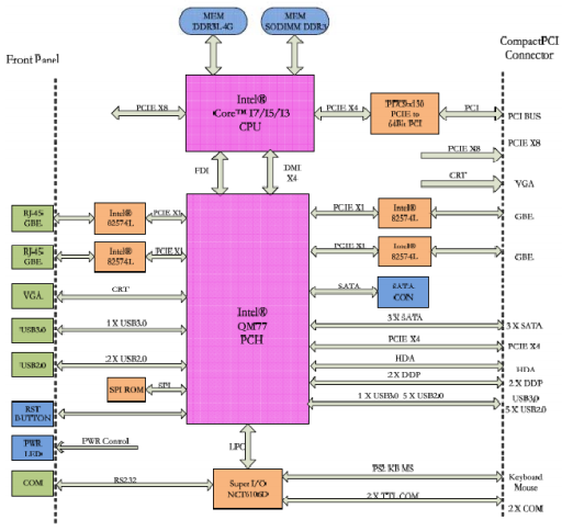 RCS 6U I7 3612主控板基于Intel® Core™ I7/I5/I3CPU 搭QM77 Chipsets(默认上 i7 3612 CPU)设计的标准6U CompactPCI 主板.。板贴4G DDR3 内存,拥有丰富的接口功能,前面板IO提供2个千兆网口( intel 82574L芯片), 1个RJ45 RS232接口,1个VGA接口,1个USB3.0接口,2个USB2.0接口,1个 reset 键,1个FRONT LED 指示灯